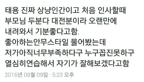 은 바로 태용~ 평소에 상냥한 건 알고있었지만 겸손하기까지해ㅠㅠ 태용이가 기분좋으면 나도 좋고 언제나 열심히하는 모습 보기좋아요^ ^