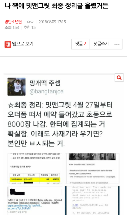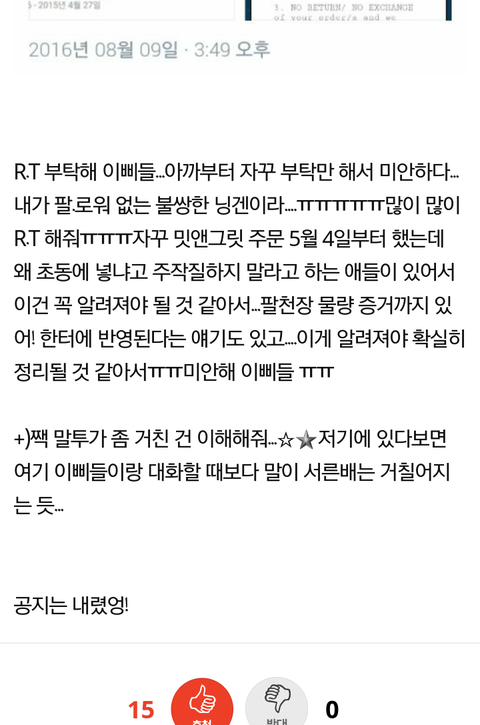 대신 좀 부탁할게 ㅇㅇ아까 계속 알티해달라고 글 올렸던 이삔데 내가 짹 가보니까 알티수 적어서. 지금 여기는 조용해졌는데 짹에선 아직도 ㅅㅈㄱ 해명하라고 빽빽대는 애들 개많음 ㅇㅇ 밋앤그릿 팔천장 초동으로 나간거 맞다는 글이니까 다들 알티 좀 부탁해. 그리고 공지 보고 애들 성희롱하는 미친련들도 짹 가서 신고 부탁함.