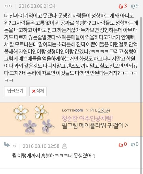 없애야하는 이유는 성형안해도 예쁜애들은 못생긴애들이 성형하면 묻히니까 그렇대 난 이거 진짜 말도안되는 논리라 생각하거든?ㅋㅋㅋㅋㅋㅋ 근데 요즘 판에 그런글 자주올라오잖아 그래서 그글에 이렇게 댓글 달았더니 반대먹고 답글 저딴거 달림ㅋㅋㅋㅋㅋㅋㅋㅋ 나만 저마인드 ㅈㄴ 이해안가는거냐?