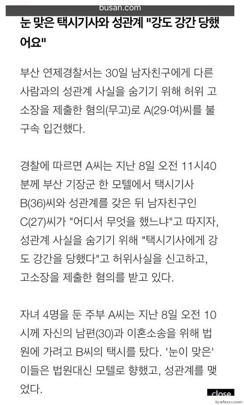 남편(30살)과 이혼소송을 하려 택시를 탔고 택시기사(36)와 눈이 맞아 모텔을 갔고 그걸 남자친구(27살)에게 걸려서 허위 신고를 했다는거...