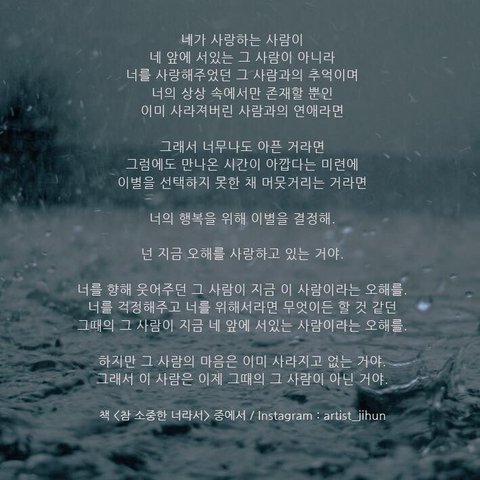 아직까지는 많이 사랑하는 것 같아 억지로 부정하지 않으려고 해. 천천히 천천히 색이바래서 희미해지면 그땐 또 어떨까 생각하면서 그냥 물흐르듯이 내버려 두려고 해.