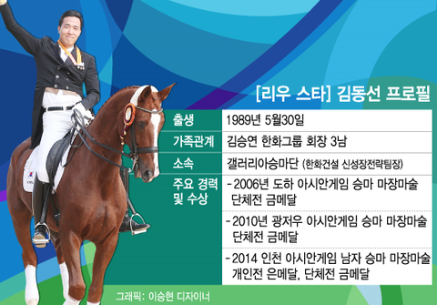 김동선은 올림픽 이전에 도하, 광저우, 인천에서 단체전 금메달을 획득해왔고 인천아시안게임에선 은메달을 거머쥐었습니다. 그리고 국제승마대회에서 3위를 차지한 경력도 있으며, 이는 당시 한국인이 구제승마대회에서 입상한 것은 최초였다고 해요.