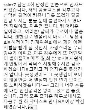 그런데, 나는 개인적으로 드라마 안의 사소한 문제 하나하나 다 지적하는 건 피곤하다고 간주함. 의학 소재지만 드라마는 드라마고, 사실 이 외의 논란 되야만 할 것들이 많은 드라마에 나타나지만 그런건 사실 인기 없는 드라마한텐 관심이 없기 때문에 그냥 넘어가짐. 물론 지적할 수 있음. 보면서 몰입도가 깨지고 불편한 사람들도 있겠지, 그래서 박신혜가 사과문을 올린거고. 박신혜가 지적한 사람들을 저격했단 의견들이 있는데 박신혜는 '지적'한 사람들한테 아무말도 안하고 '인신공격'을 한 사람들한테 자제해 달라고 함. 게다가 '괜히 열 올리지 맙시다'와 '지우는게 뭐가 어렵다고'라고 한게 비꼬는듯 하다고 하지만 표정이 없는 글로는 어감과 정확한 표현의도를 파악하기 어려움. 처음부터 안좋게 본 사람들은 감정을 이입해서 보기도 하지. 그에 따라 다르게 읽히고. 읽는 사람에 따라 다르겠지만 박신혜 입장으로선 그냥 기분 좋게, 쿨하게 인정하고 사과한거 같음. 괜히 더 논란 안되고 걱정 안끼치려 괜찮은척 털털하게 쓴것 같아.