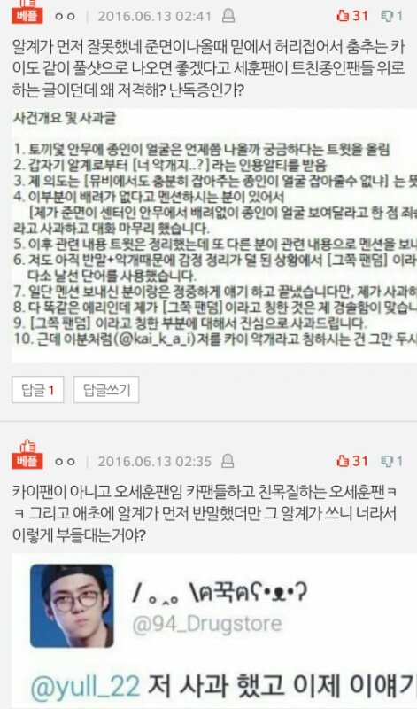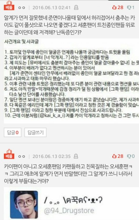 숼드친 세훈팬이 잘못인양 글 조작해서 엮어가지고 정리해서 쉴드 치다 그 글에서는 안먹히니까