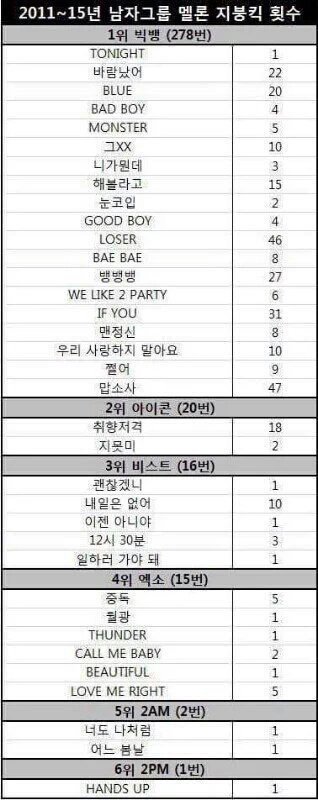 남자그룹 멜론 지붕킥 순위+여돌 포함