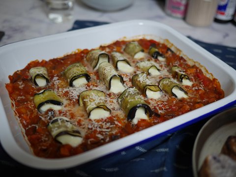 가지 세로로 얇게 썰어서 모짜렐라치즈 넣고 돌돌말아가꼬 토마토소스에 담아 구웠지요