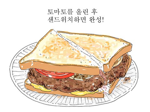 치즈를 바른 빵 위에 고기, 그 위에 양파, 마지막으로 토마토, 그리고 나머지 빵 한 장을 얹어주면 루이스 런치 버전 오리지널 햄버거 완성입니다.