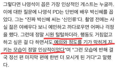 먼저 나영석pd. 박신혜는 삼시세끼에 2번 출연해서 이분이랑 인연이 있어. 게다가 한번은 부모님 가게에 초대해 곱창을 직접 구우면서 대접했다고하지. 고정 이서진, 택연 (김광규는 피노키오 촬영으로 안면있었으니 패쓰)도 박신혜가 털털한거 보고 놀랐다고 했고. 택연은 이번에 닥터스 촬영현장에 간식차도 선물했지. 여배우의 깐깐함은커녕 이렇게 시원시원한 박신혠데. 설령 7년전의 에피소드가 진실이라고 가정하자. 근데 그게 현재의 이런모습에도 불구하고 이정도의 질타를 받아야해?