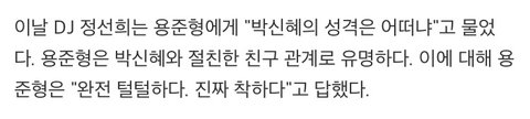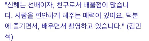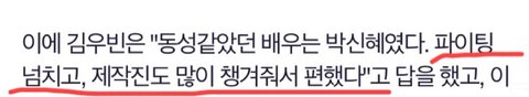박신혜 비판글 댓글에 박신혜가 자기가 선배인걸 앞세워 텃세부리며 김우빈이랑 억지로 친구맺었다고 하던데, 방송보면 알겠지만 전혀 그런거 아니였어. 원래 박신혜는 89년생들이랑 친구라 김우빈한테 그렇게 장난식으로 다가가서 편하게 해준건데, 대체 뭐가 문제인지. 재밌디며 넘어간 에피소드가 이럴땐 참 불리하게 작용한다는걸 깨달음.