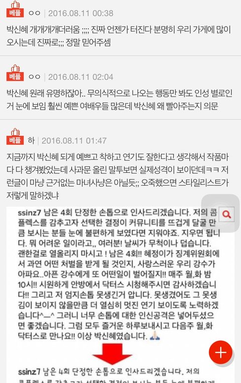 이번에 네일논란. 물론 박신혜 잘못도 아주 없지 않아. 스타일링 문제도 많았고, 그치만 연예인들이 협찬의 굴레에서 자유롭지 못한점은 다들 알잖아. 그리고 네일은 이유야 어찌되었든 사실 그런일에 인신공격까지 받았는데도 해명하고 피드백했고. 사과문 말투? 정말 기사화되지 않았고 남들이 욕하기 전에 봤으면 이정도로 비난을 받지 않았을거야. 사실 많은 사람들은 문제성을 전혀 못 느끼겠다고했고. 네일하나로 엄청난 수천개의 욕들을 먹고, 고소하지 않고 털털하게 죄송하다 인정하고, 악플러들에게는 자제해 달라고 했잖아. 말투는 글의 표정을 읽을수 없기 때문에 우리가 판단할 수 없어. 개인적으로는 걱정 끼치지 않으려고 오히려 사과 받아야하는 입장인데도 더 쿨하게 쓴것 같지만.