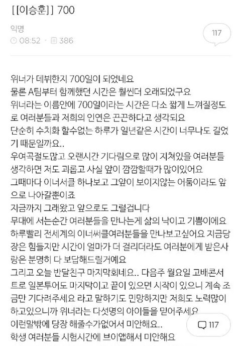애들 너무 보고싶어서 일이 손에 잡히진 않지만 소식 올라올때까지 그냥 난 내할일 하면서 애들 기다리려구ㅠㅠㅠ와이지때문에 힘들어도 탈덕은 절대 못할거같다 애들이 팬들 생각하는 마음이 우리 생각 이상으로 깊다는거 그리고 우리만큼이나 무대를 그리워했고 우리가 위너를 보고싶어하는만큼 애들도 우리를 보고싶어했구나 이런걸 콘서트에서 펑펑우는 애들을 보면서 느꼈거든ㅠㅅㅠ