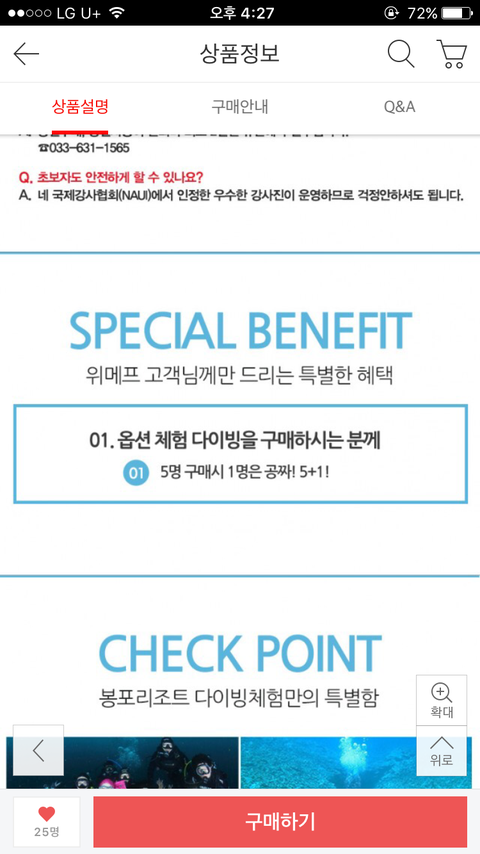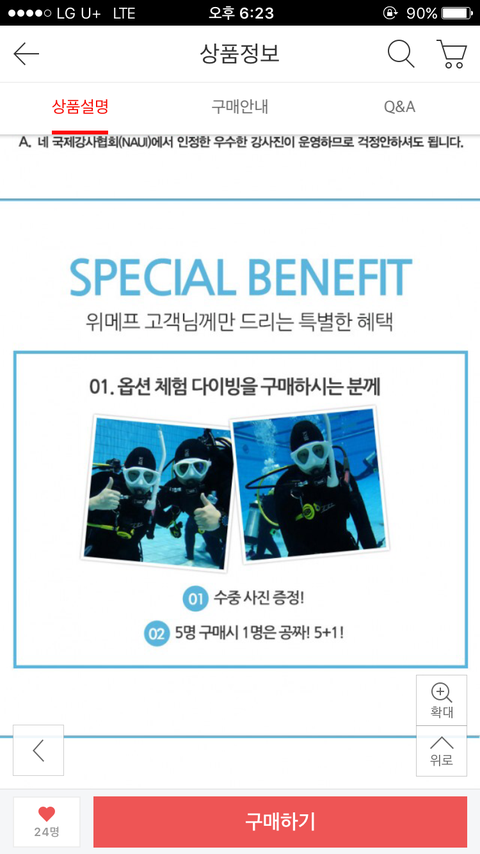 상품 옵션에 스쿠버다이빙 체험이 1번옵션이고 이티켓을 구매하는 위x프 고객에게 사진을 찍어준다고 하길래 좋아했어요