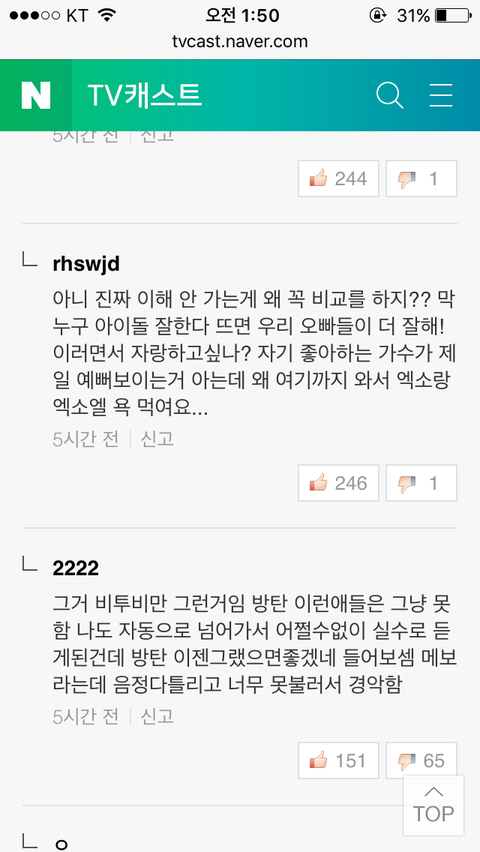 솔직히 멜로디입장에서 기분나빠요 ㅠㅠㅠ저 댓글이 비투비 깍아내리는거 모르나 왜저러는지 진짜 방탄도 좋은 가수인거 확실하고 그런데 왜저러는지 모르겠네요ㅠㅠ