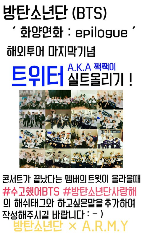 비록 한국아미들과의 화양연화는 5월에 끝났지만 해외아미들과 맞은 화양연화는 아직 끝나지않았는데 몇시간뒤면 아예 끝나게 되버리는 화양연화를 더 화사하고 의미있게 끝내기위해 실트올리기! 를 준비해봤어 ! 하는방법은 나와있는대로 매우 쉬우니까 많이 참여해줘 !