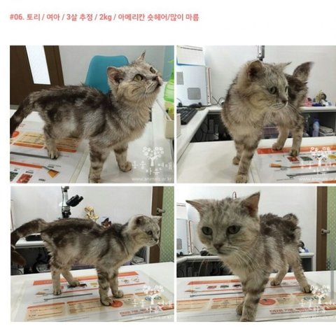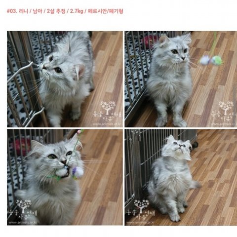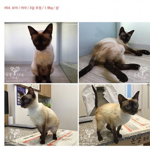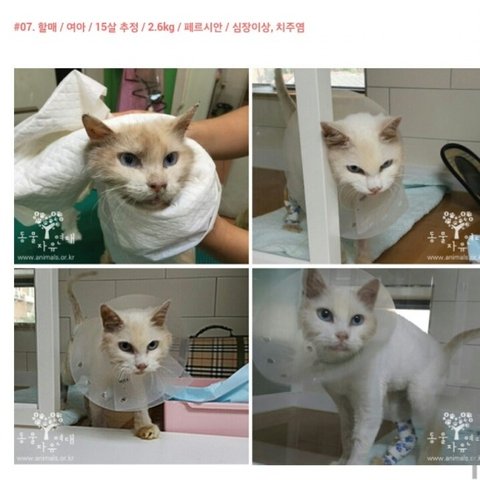 현장들을 방문해 조사를 진행하던 중, 경악을 금치 못했던 고양이농장을 발견하게 되었습니다. 비, 바람, 더위 등으로부터 보호 받을 수 없는 열악한 외부환경과, 고양이의 습성을 무시한 밀집사육방법, 암수 구별 없이 같은 품종끼리 합사된 사육방법. 무엇보다도 건강하지 못한 고양이들의 상태와 그런 상태가 무색하게 사람의 손길을 갈구하는 고양이들을 보고 또 말문이 막혀 버렸습니다. 이런 환경을 질책하자 돌아오는 대답은 "사람이 우선이지 동물이 우선이냐" 였습니다. 언제나 똑같습니다. 불법 농장주들의 대답은 참 한결같습니다. 농장주가 경제적인 어려움을 호소하여 농장을 정리하고 고양이들의 소유권을 다 넘기면(동물자유연대 매입) 구청을 통해 기초수급자 등을 통한 사회복지시스템의 보호를 받을 수 있는 방법에 대해 최대한 노력하겠다고 해도 요지부동 입니다. 그렇다고 강제로 철거를 한다거나 강제로 고양이들을 데리고 올 수도 없습니다. 부산시청 동물보호팀, 환경부서, 문화재부서, 산림부서, 건축부서 등 법적으로 제재할 수 있는 방안을 총동원 했으나 현행법 어디에도 이 상태를 강제로 당장 종식시킬 법은 없습니다. 그나마, 수차례의 방문을 통한 설득을 통해 겨우 7마리의 고양이만 구조할 수 있었습니다. 동물보호법으로 동물을 구조할 수 없다면 도대체 우리는 어떤 법으로 고통받는 동물을 구조할 수 있을까요? 조속한 동물보호법 개정을 촉구합니다. 7마리의 고양이들은 구조 이후 부터 현재까지 4곳의 동물병원에 분산 입원 해 치료하였습니다. 입원 초기부터 변상태가 좋지 않아서 애를 먹였습니다. 또한, 각각 폐기형, 심장이상, 치주염 등의 고질적 질환을 가지고 있었고, 중성화수술을 통해 장간막충혈, 난소낭종 등의 질환이 발견되었습니다. 또한, 입원 당시의 몸무게가 한 마리를 제외하고는 다 2키로가 채 안될 정도로 작고 야위어 있었습니다. 하지만 이제 거의 완치되었고 가정에서 살뜰한 보살핌의 치유만 남았습니다. 동물자유연대는 강아지공장 해결을 하는 가운데 80여 마리의 동물이 들어오는 바람에 더이상 보호할 수 있는 공간이 없어, 이 고양이들은 현재 치료를 다 하고도 동물병원에서 대기 중에 있는 안타까운 상태입니다.평생을 열악한 환경에서 임신과 출산만을 반복하다 사라질 뻔 했던 고양이들에게 이제 남은 묘생을 편하게 보낼 수 있도록 보금자리 한 켠을 내어 주시길 간곡히 부탁드립니다. 이 고양이들은 어느 펫샵들에서, 어느 온라인에서 이쁘다, 귀엽다 라고 사람들을 감탄하게 만든 "품종묘" 새끼고양이들의 아빠이자 엄마 입니다.