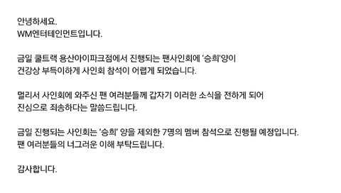 승희가 건강상의 문제로 팬사인회에 참석을 못한다는 공지였습니다 팬들이 원하는것은 건강이 힘이 넘칠 정도로 건강한거 말고 보통 사람처럼 그냥 보통 팬들이 걱정하지 안 할 수 있도록 그정도의 건강함을 원했습니다