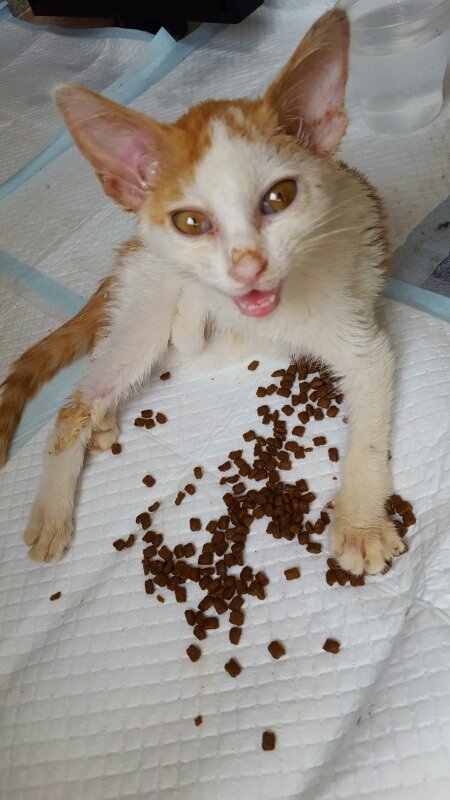 극복이예요 지금 요상태에선 깔깔이를 안씌었지만 평소엔 상처를 햛지못하게(햛으면 곪아요ㅜㅜ!)씌어놔요~! 그래서 밥을 먹기힘들어해서 사료를 아래에 깔아놨어요!