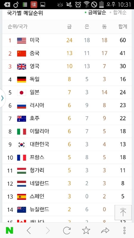 올림픽 메달 순위 현황...