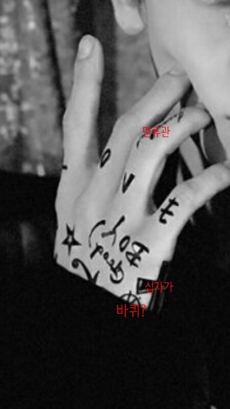 영생의 의미로는 바퀴가달린 십자가를 사용한다캐서 잉 바퀴가있나하고 손 보다가 설마 저 십자가 옆에있는 동그라미가 절반가려져서 그렇지 바퀴가 아닐까싶음 그리고 십자가 달릴때 면류관인가 가시달린 뭐 쓰는거로 알고있는데 그건 손가락에있는 길쭉한 가시모양 잘보면 저 가시모양 길쭉한게 화살표모양인데 화살표가 박찬열 얼굴을 가리키고있고 가시길쭉 중간에 물방울모양이 하나 튀어나와있음 피가아닐까싶음 면류관쓰면 피나니까..? 똥궁예니 믿거나말거나임 영생이라해서 음