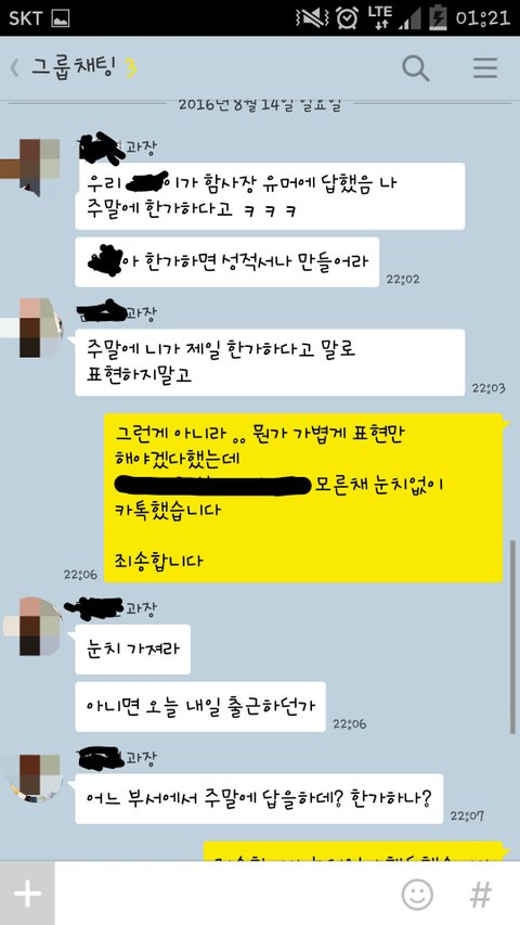 그러더니 넌 눈치가 없다. 다른부서 주말에 바쁘고 그러는데 어찌 한가한 티를 내는것 마냥 카톡을 보내냐,