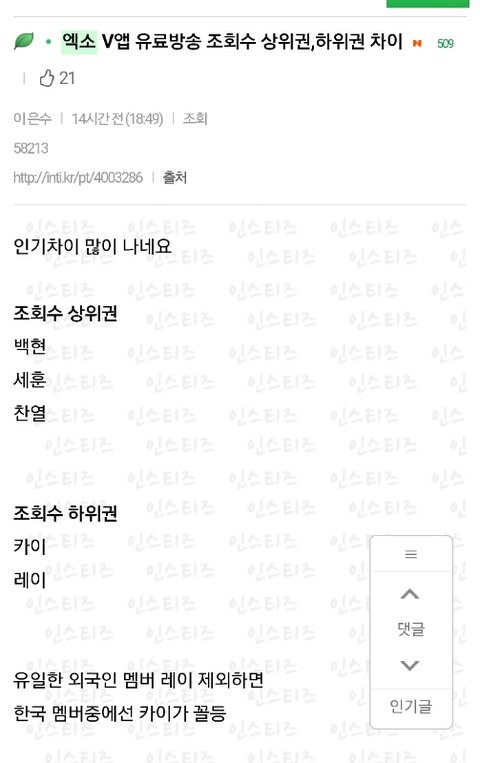 백현 인기 상위원 정치질할거면 그냥하지 카이 꼴찌라는 정치질은 왜하는거야?