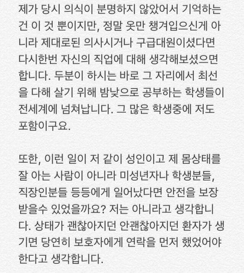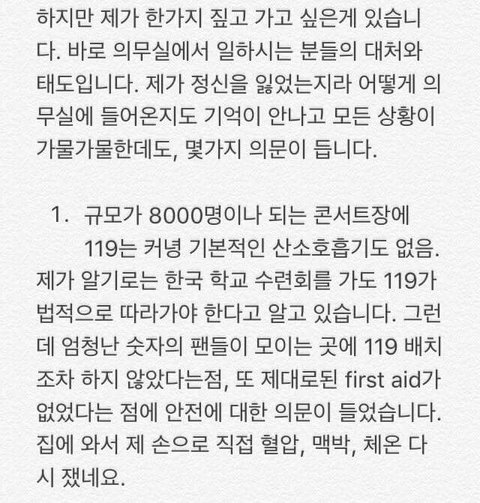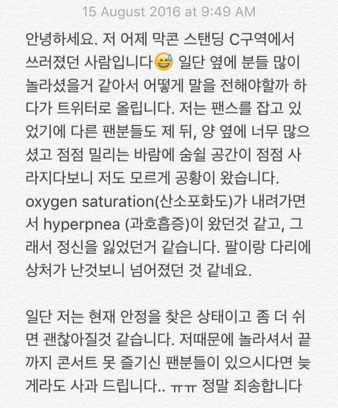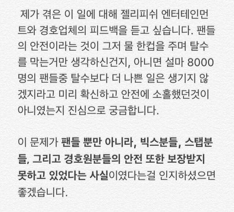 이밖에도 튕겨넘어지신분들 등 다친분들이 몇몇분계시는데 기본적인 조치도 취하지않고 구급차도 없었습니다. 목숨을 담보로 죽을 각오로 콘서트를 가야 하나요? 적어도 안전은 보장받았으면 아니 안전을 보장받는건 당연하다고생각합니다.