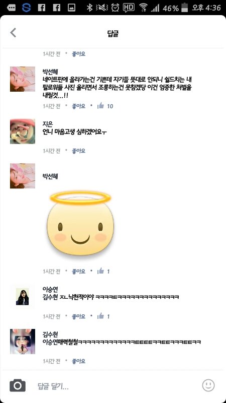 얘 유명하지도않고 뭐맨날지혼자 공감될려고공감글올리더니 지금페북댓글엔 언니 ㅠㅠ낙천적이양 ㅗㅠㅜ귀여워용~~~~~ ?