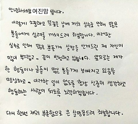 사과문 잘 쓴 예 : AOA 지민, 세븐틴 원우 / 사과문 다시 써야 하는 예 : 최여진 엄마, 소녀시대 티파니, 엑소 찬열