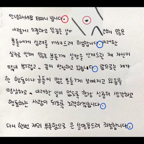 + 추가 이렇게 많은 사람들이 볼 줄은 몰랐어 단지 난 억측으로 티파니를 까고 싶어서 이 글을 쓴 게 아니야 티파니가 반성문에 하트를 그렸다는 글을 읽었고 나 뿐만이 아닌 많은 사람들이 그렇게 생각하길래 글을 올린 거야 더 많은 사람들이 이 글을 보고 내 생각이 맞나 아닌지 판단해줬으면 해서 티파니 팬들이 기분 나빴다면 미안한데 제발 이상한 쉴드 치지마 지금 티파니가 큰 잘못을 한 거고 그거에 따른 비난은 어느정도 받아야한다고 생각해 물론 이번 일 아닌 것까지 가져와서 까는 건 아니라고 나도 생각하고 난 티파니가 진심으로 반성했으면 좋겠다 저 사과문으로는 전혀 반성이 안 느껴지거든