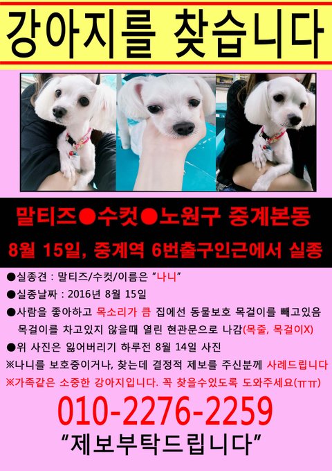 노원구 중계역쪽 잃어버린 강아지를 찾습니다.