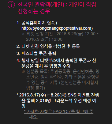 http://pyeongchangkpopfestival.com/?LID=KORㅍㅊ페스티발사실 티켓팅은 아니고 이벤튼데 우리가 표 많이 따자!못가는 애들은 갈수있는 애들한테 꼭 표 양도해주고!!저 2018명이 전부 베비들이었으면 좋겠다 ㅋㅋㅋ 함성소리 지리게