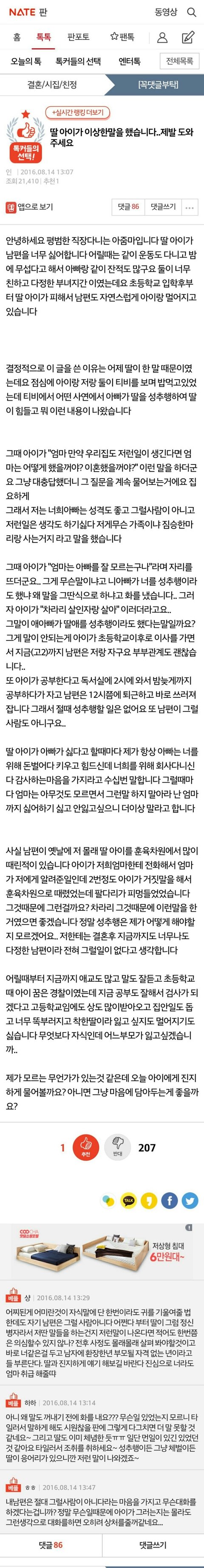 차라리 주작이어라 싶을만큼 딸이 너무 가여움..저런놈년들을 가족이고 부모라고 같이 살아야한다니