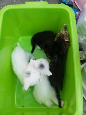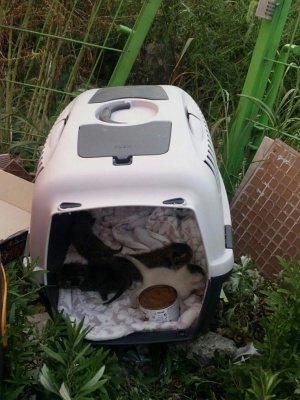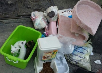사료급식기 화장실 캣타워 패드 간식과 함께 아기4마리를 쓰레기장에 버렸어요