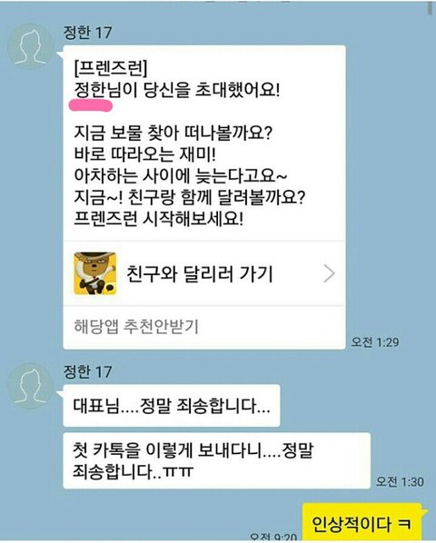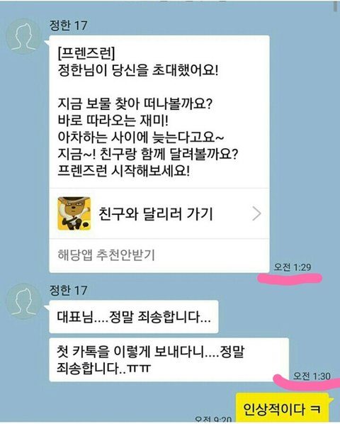게임 초대 메세지를 보낸 시간과 죄송합니다..를 보낸 시간 1분차이 우리는 여기서 다시한번 위대함을 느끼죠 초콜릿원료게임을 한번이라도 해보신 분은 아실거에요 게임을 하다보면 생명이라던가 생명이라던가 생명을 얻기위해 초대메세지를 보내게 되죠 초대메세지는 게임속에서 자신의 ㅋㅋㅇㅌ 친구목록중 이 게임을 하지 않는 사람들이 주르륵 뜨고 대부분 의식없이 쭈욱 보내기를 누르죠