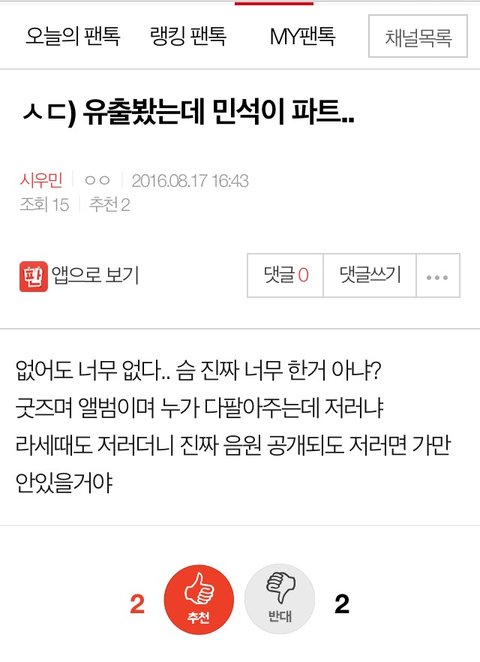 민석이 베톡글에는 반대 3개씩 찍고다녀 쟤
