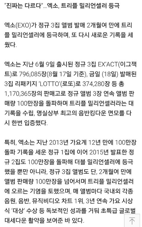 이그잭트 정규 3집 79만장 이그잭트 정규 리팩 37만장 계속 정규앨범만 1집때부터 밀리언셀러 달성해옴. 네이버 메인에도 걸리고 두달만에 트리플밀리언셀러를 달성했다함.