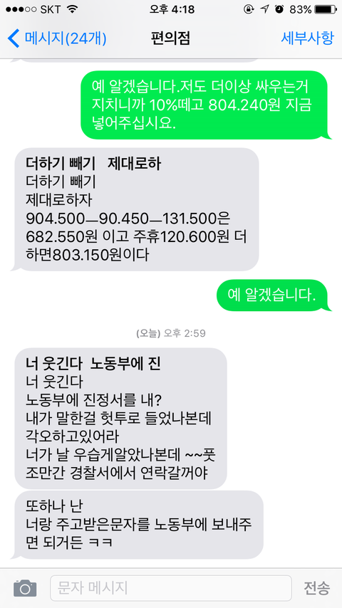 얼마뒤에 대한법률구조공단에 물어보니까 10만원에 대한 손해배상은 억지이며 배상할 의무가 없다고 답변을 하시더라고요. 그래서 더 확신에 차 10만원 손해배상비와 10퍼센트 떼인 알바비를 노동청에 신고했습니다. 그러자 점장님이 저렇게 문자를 하면서 협박을 하시더라고요.
