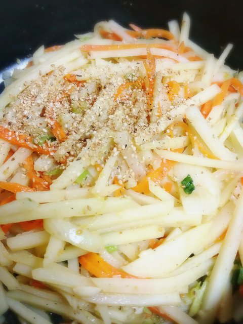 집에서 재배한 감자를 열심히 채썰어 살짜쿵 데친 뒤 후라이팬에 들들 볶음..그러나 싱거웠다