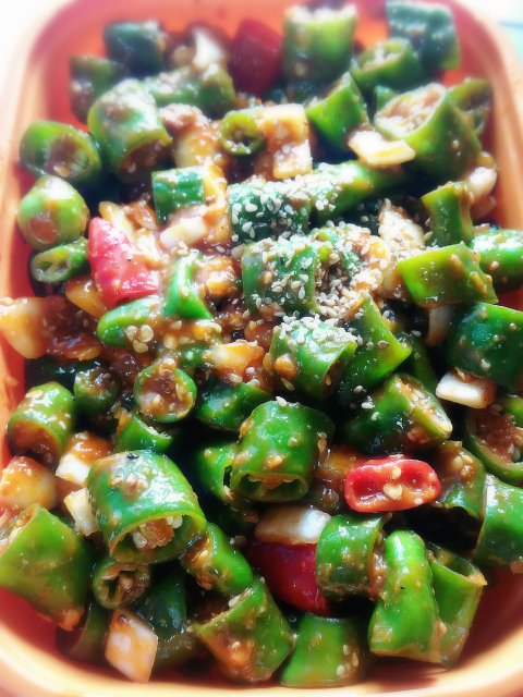 집에서 키우는 청양고추 한 무더기 따다가 고추장 된장 꿀로 소스 만들어 주물주물 울 아바지께서 칼칼하다구 좋아하시는 반찬