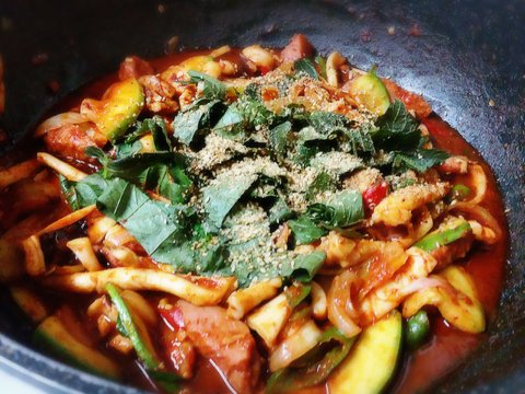 국산 저려미 오징어 2마리로 매콤하게! 마지막은 깻잎 썰어 향을 더하였고..