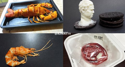 식빵으로 만든 랍스타, 오레오로 만든 석고상, 식빵으로 만든 새우, 초콜릿으로 만든 한우 입니다.