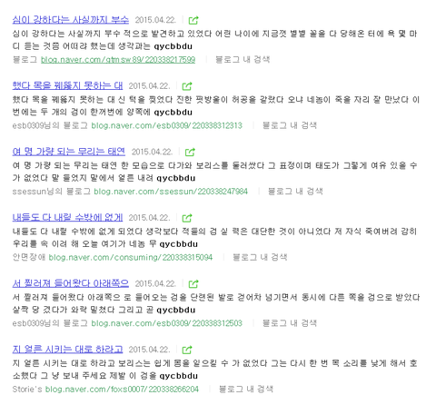 qycbbdu가 뭔가 싶어 네이버에 검색해봤는데 네이버 블로그 게시글에 저런 글들이 올라와있더라구요.. 근데 그 내용들이 너무 소름이 돋아서 저게 뭔지 아시는 톡님들 계신가요??ㅠㅠㅠㅠ