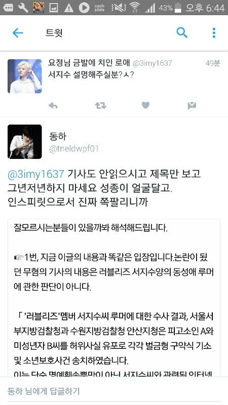 기사 내용은 동성애 루머가 아닌 다른 재판의 무혐의 처벌이었음. 근데 짹에 어떤사람이 기사를 읽어보지도 않고 트윗을 올림. ㅅㅈㅅ 그년때문에 처벌받으면 얼마나 억울했겠어 라고.. 성종이 얼굴달고 욕질하는 것도 짜증나고 혹시 울애들이 저거보면 무슨생각하겠어.. 그래서 한마디 하려고했는데 어떤분이 그사람한테 직멘을 날림