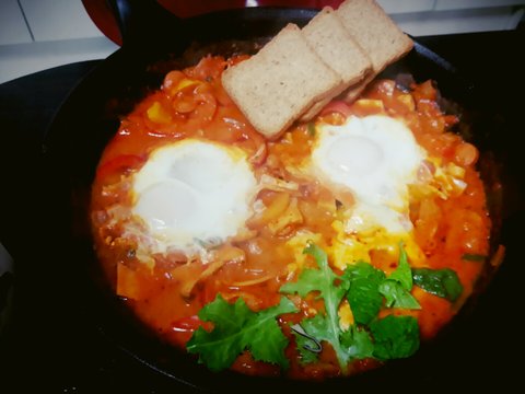토마토소스에 청양고추 양파 베이컨 햄 넣어 끓인 후