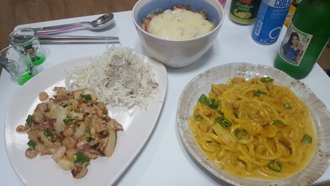 집밥 백선생에서 보고 따라해 본 가지라자냐랑 카레우동이에요~ 이자카야에서 안주로 갈릭새우마요를 먹었던적이 있는데 넘 맛있어서 같이 해 먹었어용ㅋㅋ 카레우동은 우유에 카레가루 2큰술 풀고 우동 넣어서 익히기만 했는데 간단하고 맛도 괜찮았어요!