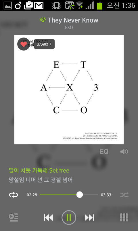 엑소음원순위=달빛에 짙게물든밤 우리의 유일한시간