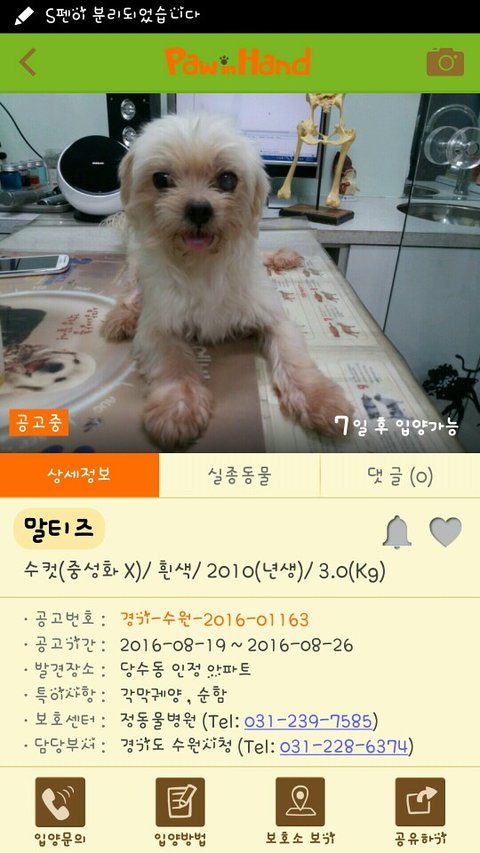 버림을 받은것으로 추정되며 안락사만이라도 막을수있도록 여러분들의 관심 부탁 드리겠습니다.