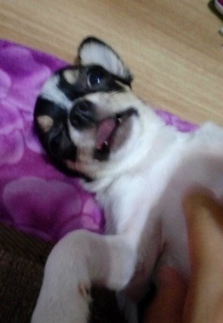 입이 살짝 벌이지고 네 발을 모은 쵸보기는