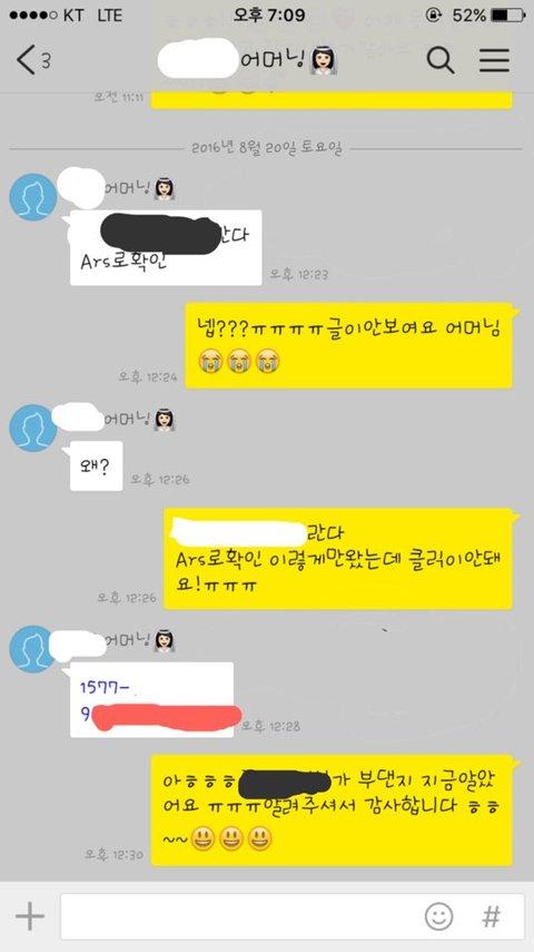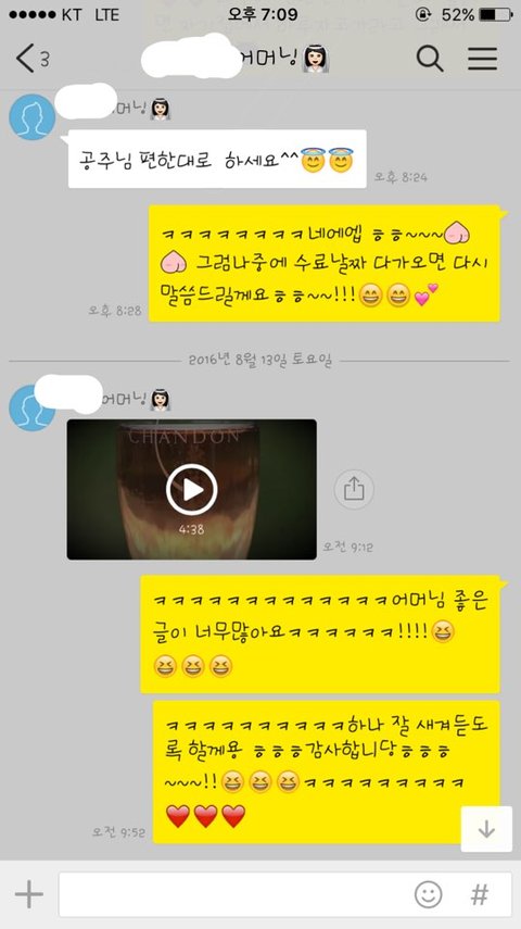 ' 어머님! 제가 저번에 ㅋㅋ를 많이 써서 기분나쁘신건 아니죠??ㅠㅠ... 그때는 아무생각 없이 감사한 마음에 얼른 답해드려야지 하고 보냈는데 다시보니까 제가 비웃은것 처럼 보여서 살짝 걱정되요ㅠㅠ 저번엔 친구만나서 들떠있는 와중에 본거라서 웃는표시가 좀 많았던것 같아요..그래서 혹시 대충 봤을까봐 집에서 다시 봐야지 하고 하나하나 다시 다봤어요!♥ 다음에 혹시 답하게 될일이 생긴다면 그때는 충분히 생각하고 답드릴게요 저번에 보내주셨던 좋은글 아직까지도 정말 감사하게 생각하고 있어요ㅠㅠ♥'