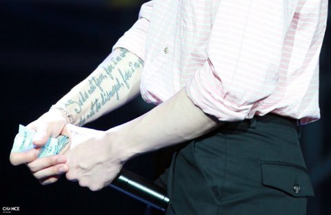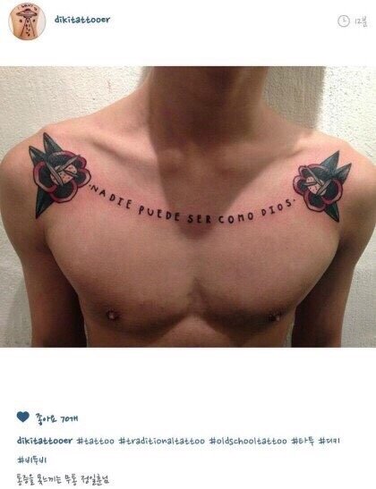 정일훈: 팔에 천주교관련 / 가슴에 큰거 / 최근에 옆구리쪽에 생긴 1004대충 이런 타투 / 팔에 강아지발자국